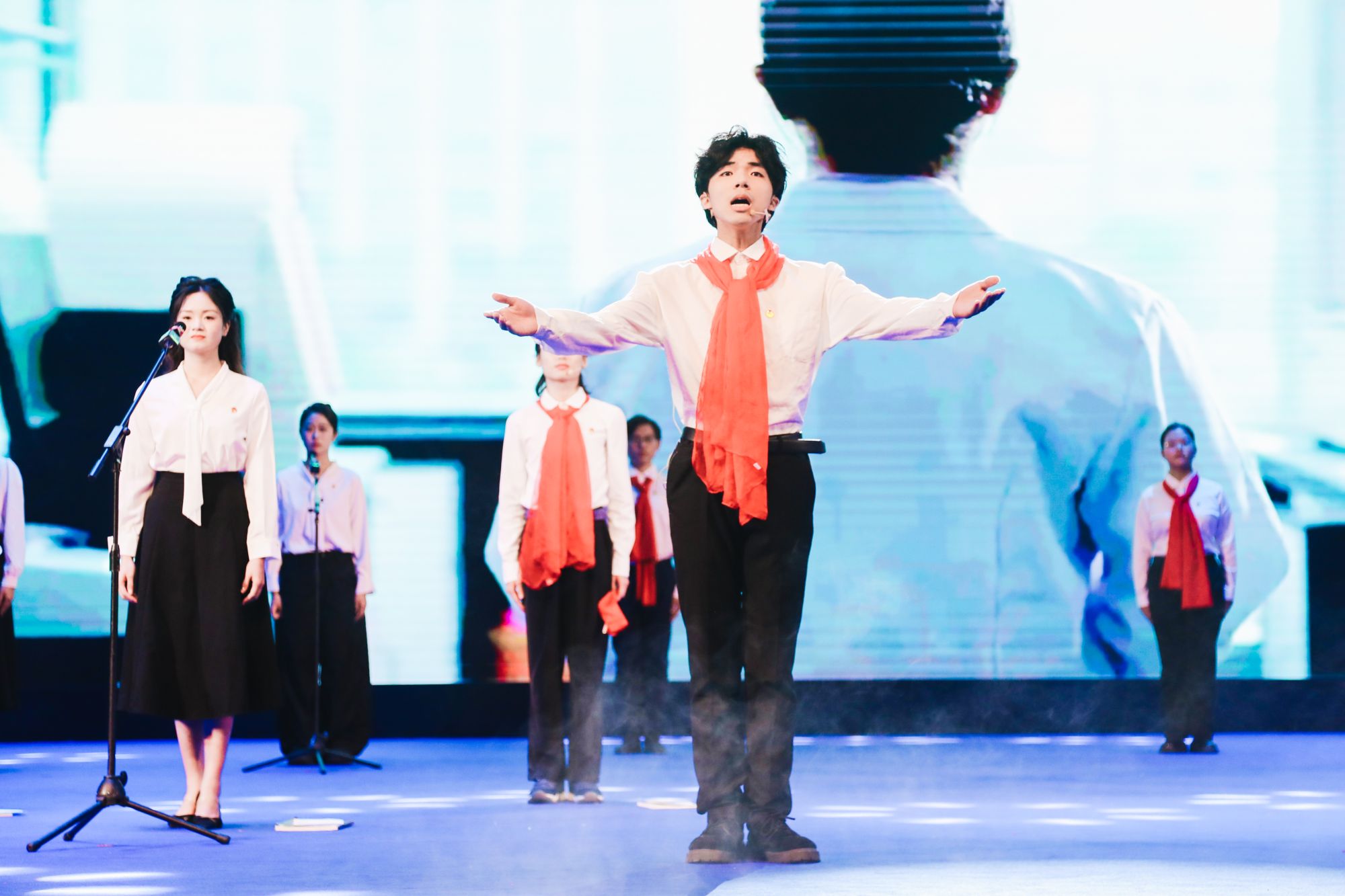 学生组展演中,参赛选手以青年大学生的视角激情奔放、热血豪迈地歌颂着一代又一代中国热血青年担负使命,为中华民族伟大复兴而矢志奋斗;教师组竞赛节目融合了朗诵、情景演绎、乐器演奏等艺术表现形式,赢得了现场团员青年的热烈掌声,青年教师们在铿锵节奏中献上一首首深沉豪迈的英雄礼赞。
