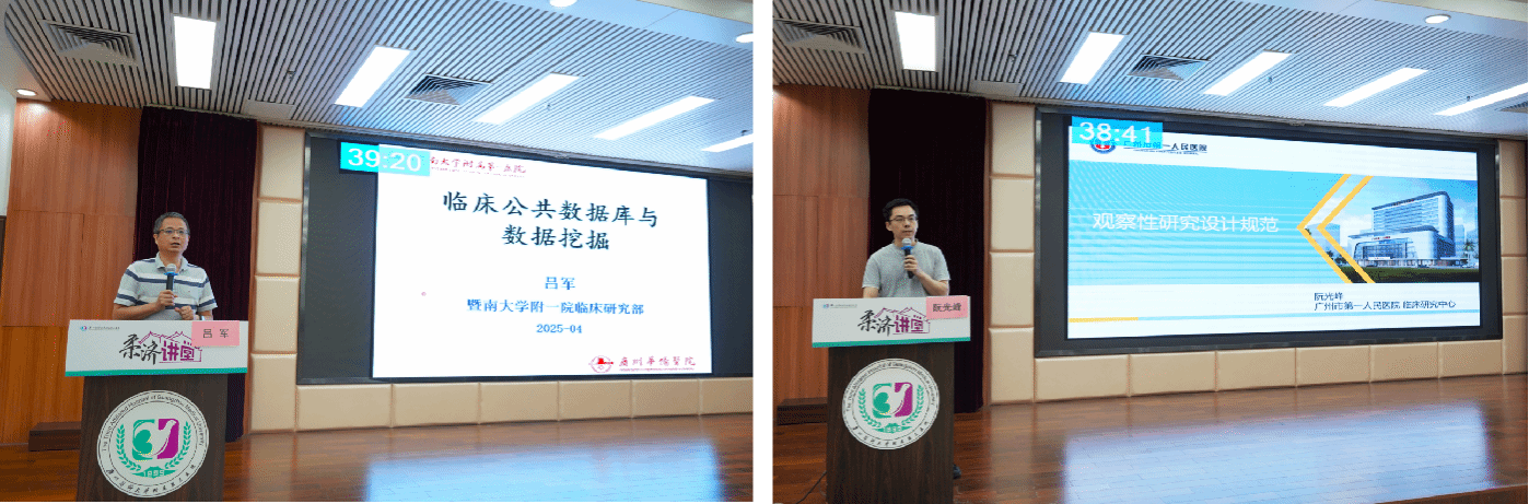 暨南大学附属第一医院吕军研究员以《临床公共数据库与数据挖掘》为主题,介绍了常用临床公共数据库,并分享多篇高分论文的数据整合经验。广州市第一人民医院阮光峰副研究员就《观察性研究设计规范》展开讲解,介绍了目前常用的观察性研究设计以及偏倚控制,结合研究案例阐释高质量证据的生成路径。