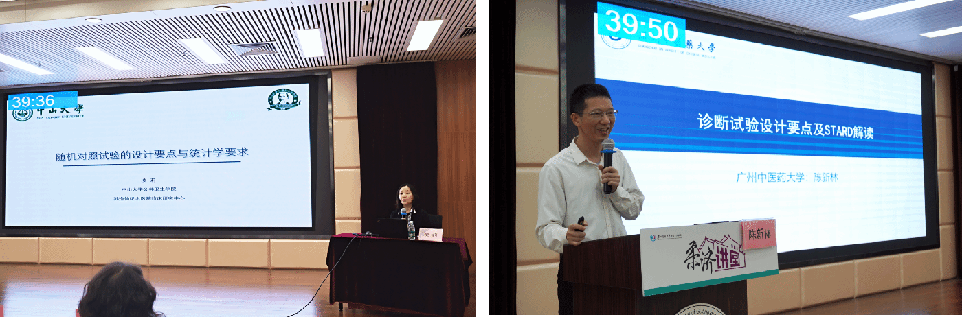 随后,中山大学公共卫生学院凌莉教授以《随机对照试验的设计要点与统计学要求》为题,站在统计学的角度讲授了随机对照试验设计中研究假设、人群选择、实施要点、统计分析策略等内容。广州中医药大学陈新林教授就《诊断试验设计要点及STARD解读》进行全面细致的分享,涵盖诊断试验的设计、评价指标等方面。